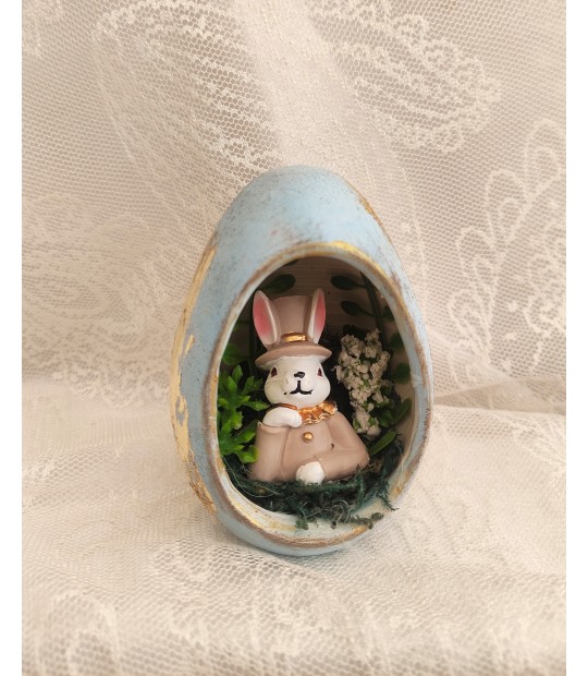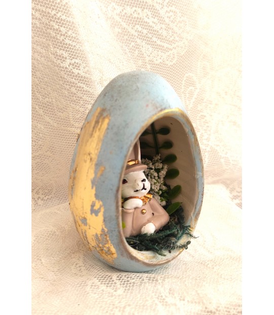 Διακοσμητικό πασχαλινό χειροποίητο αυγό που έχει μέσα λαγό σε σιέλ χρώμα με φύλλο χρυσού σε διάσταση 11Χ8εκ