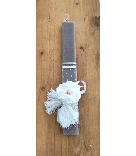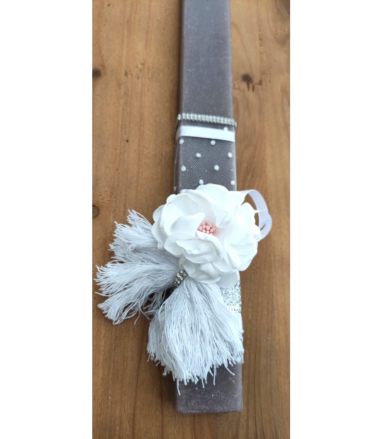 Χειροποίητη λαμπάδα με λευκό λουλούδι και ασημί λεπτομέρειες σε πλακέ κερί σε χρώμα καφέ-γρι σε διαστάσεις 3Χ31εκ