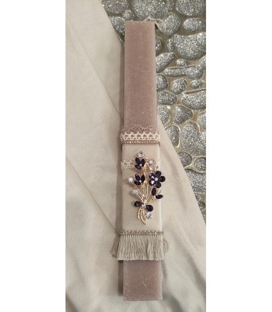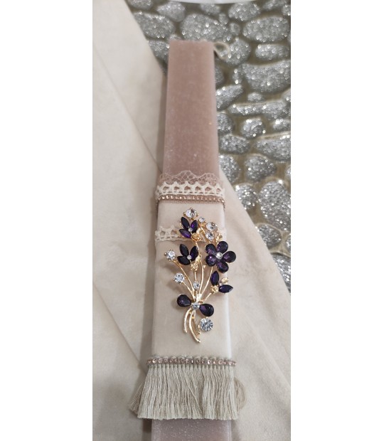 Χειροποίητη λαμπάδα με καρφίτσα χρυσή με μωβ κρυσταλλάκια σε σχήμα ανθοδέσμη δεμένη σε λευκό αρωματικό κερί 30Χ3εκ