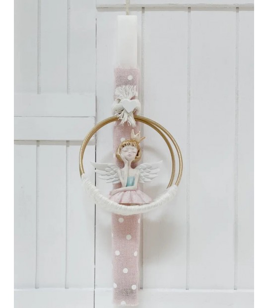Χειροποίητη λαμπάδα με λευκό κερί και στολισμένη με αρωματική νεράιδα με κορώνα που μοσχομυρίζει σανταλόξυλο, σε παστέλ αποχρώσεις και διάσταση 30εκ.