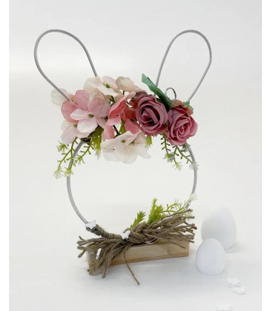 Πασχαλινό διακοσμητικό bunny head σε ξύλινη βάση με όμορφα ροζ λουλούδια σε διαστάσεις 15Χ3,5Χ25,5εκ