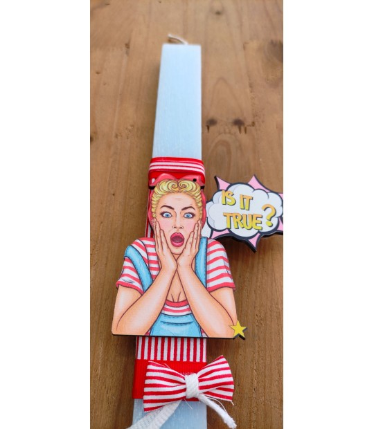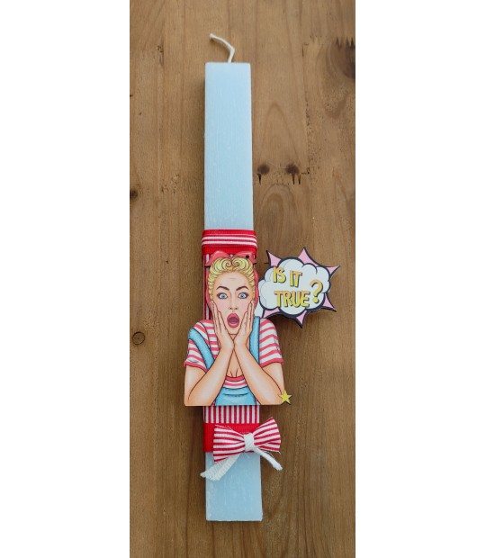 Χειροποίητη λαμπάδα με ξύλινο διακοσμητικό κορίτσι σε κόκκινες και γαλάζιες αποχρώσεις 3Χ30εκ.
