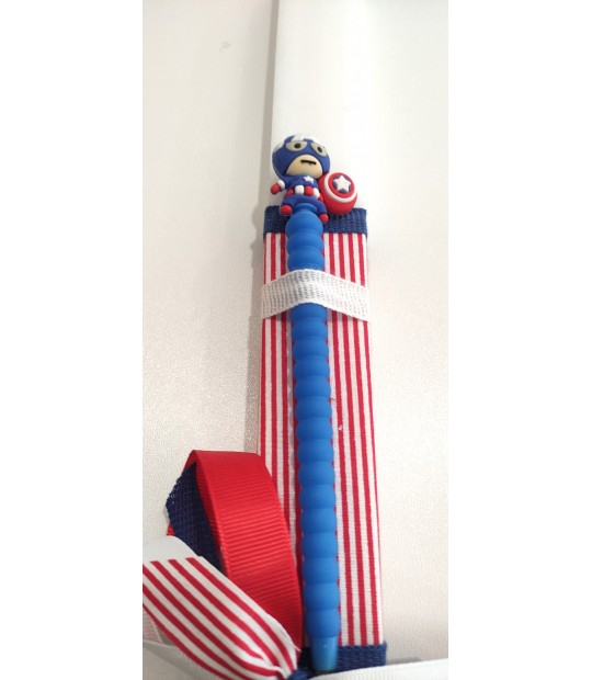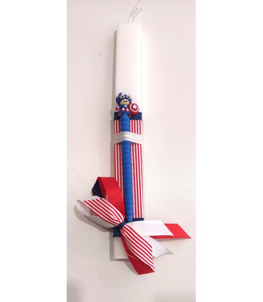 Χειροποίητη λαμπάδα με μολύβι CAPTAIN AMERICA σε χρώματα μπλε κόκκινο ,στολισμένη σε λευκό αρωματικό πλακέ κερί 30εκ.